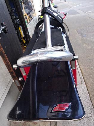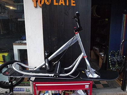 トップブランド、JYKK SNOWSCOOT(R)の2004-5年ごろの軽量アルミフレームをベースに組んだスノースクート初めての方にもオススメの中古モデル。トップチューブが太くて剛性があり、しかも軽い。