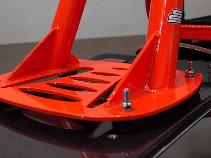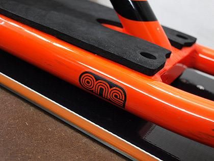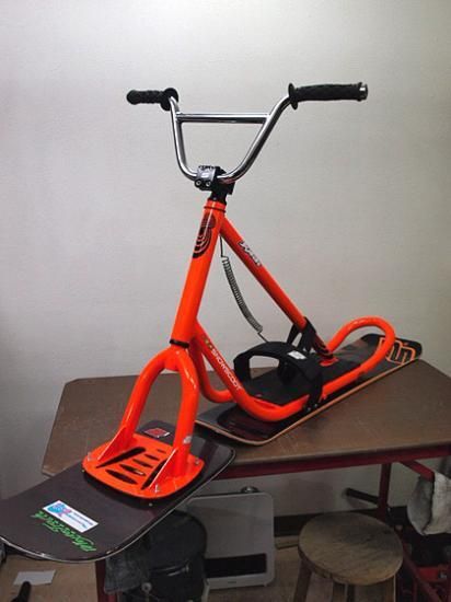 トップブランド、JYKK SNOWSCOOT(R)の入門モデルONEの軽量アルミフレームにフロントはコントロールしやすい細身ボード、リアにはなんと!パウダーやカービングもお任せのGボードをアッセンブル。