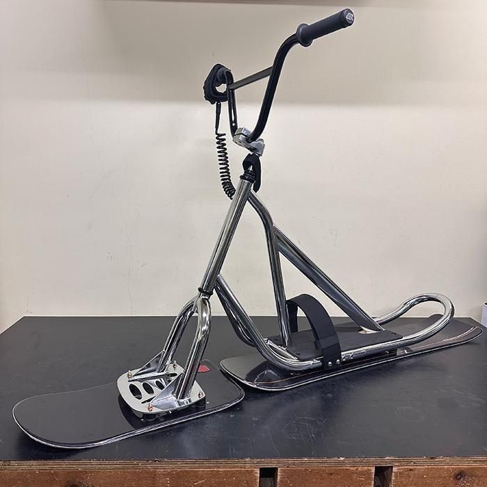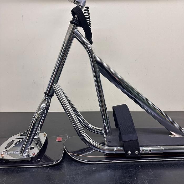 スチールメッキフレームは大変珍しく最新フレームに比べて安定感があるのが特徴、そこに未滑走の細身のベーシックボードミディアムフレックスを組み合わせてゆるく楽しく乗りやすい一台に仕上げました