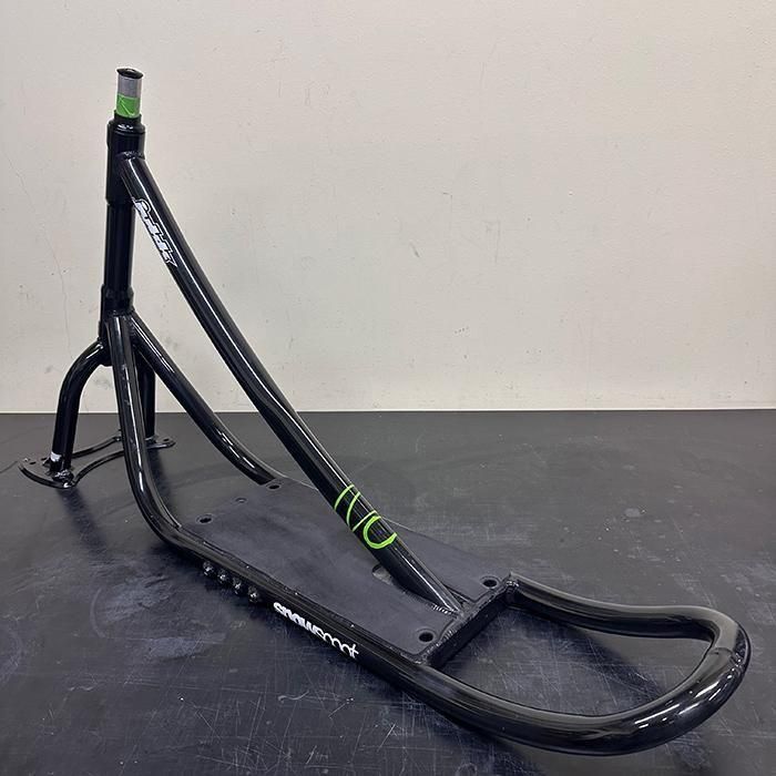深いRのトップチューブによる滑走姿勢とトリックの自由度、軽量なフルアルミパイプ。バランスが良く名フレームと行ってもいい元祖Fフレーム形状、M8取り付け穴で様々なブッシュにカスタムしやすくデッキはノーマル幅で軽量。