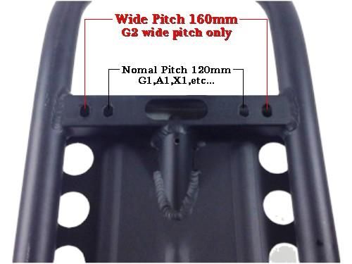 かなりワイドなG2ボード装備に伴い、フレームとの取付位置が左右で20mmずつの位置に増設されました。(ワイドピッチ対応フレーム&ボード)